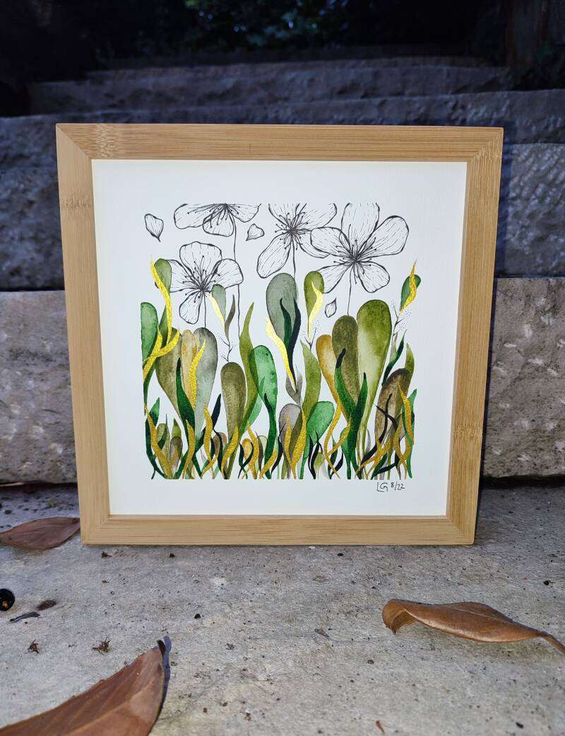 Aquarell & Tusche & Gold, Farbgebung: Grüntöne, 20 x 30 cm. Handgefertigtes Einzelstück.
