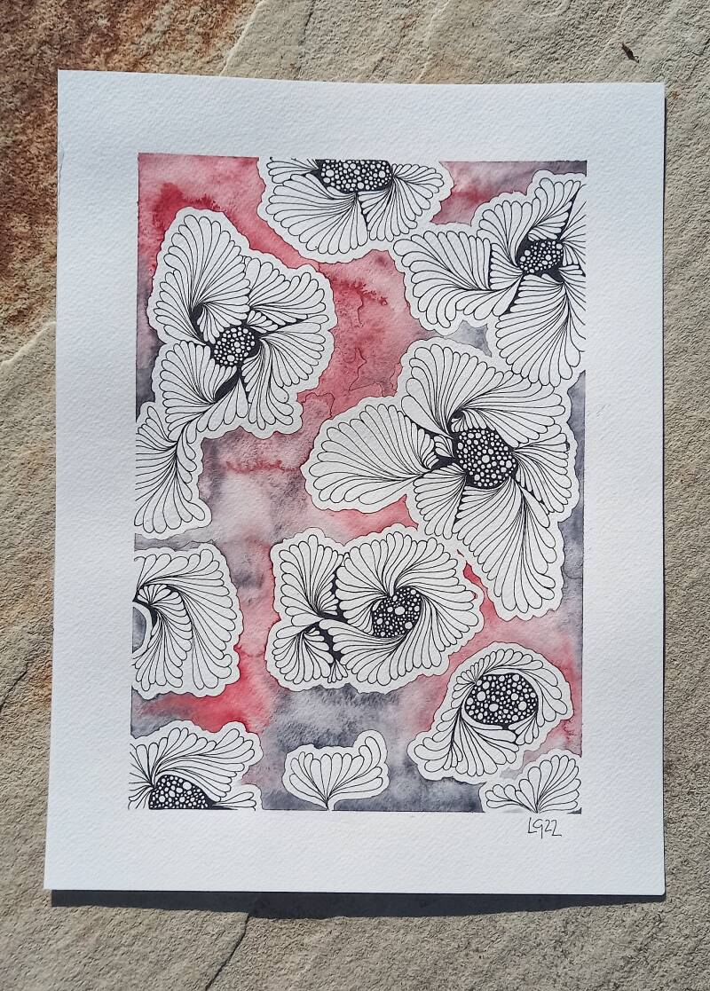 Aquarell & Tusche auf Papier, Farbgebung: weinrot, grau, 24 x 32 cm. Handgefertigtes Einzelstück.