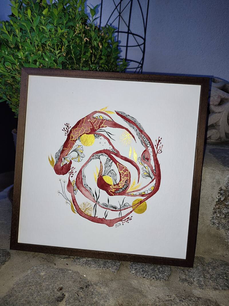 Aquarell & Tusche & Gold, 20 x 30 cm, Farbgebung: rot, grau, gold. Handgefertigtes Einzelstück.