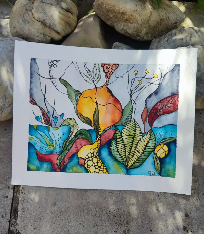 Aquarell & Tusche auf Papier, Farbgebung: grün, rot, orange, 24 x 30 cm. Handgefertigtes Einzelstück.